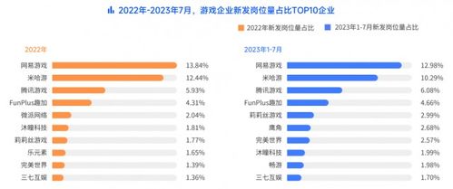 从新发岗位量来看,网易游戏、米哈游、腾讯游戏连续两年成为行业TOP3企业。其中,网易游戏凭借2022年新发岗位量占比13.84%及2023年1-7月的12.98%,稳居首位。新锐厂商米哈游超过腾讯游戏,连续两年位居第二名。这表明头部企业招聘活跃,新锐厂商在游戏行业逐渐崭露头角。